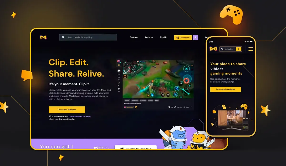 A indústria de games é um segmento que não para de crescer, movimentando bilhões ao redor do mundo. Dentro desse mercado, a Medal.tv é um dos projetos mais desafiadores que nosso time já fez: um app que grava clipes de jogos, compartilha em redes sociais e oferece um vasto leque de opções para customizar estes vídeos. Com design e desenvolvimento do nosso time, fizemos o site oficial do app, um trabalho de design exemplar todo construído a partir da marca, além de uma pesquisa e consultoria de UX que contemplou um relatório completo para a empresa definir seu roadmap tanto para a área logada do site quanto para o próprio aplicativo.